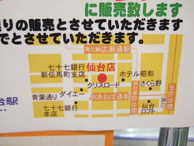 POPによると「とらのあな仙台店のレシートをお持ちの剛毅!!なお客様 先着2名様に販売いたします」とのことで、購入にはとらのあな仙台店のレシート掲示が条件みたいです。(POPに掲載されていた仙台店周辺地図)