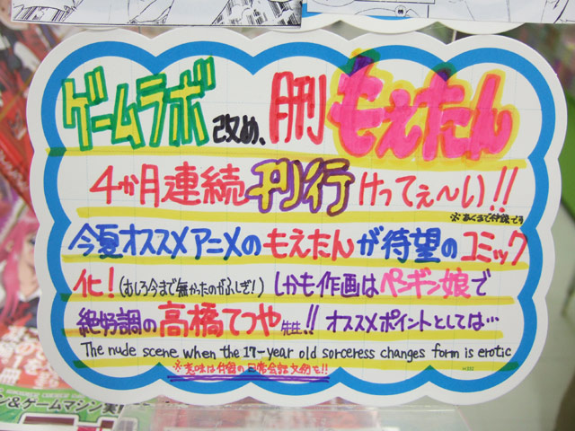 このコミック小冊子がおまけにつくことから、メロンブックスのPOPでは「ゲームラボ改め、月間もえたん 4か月連続刊行けってぇ〜い!!※あくまで付録です 今夏オススメアニメのもえたんが待望のコミック化!(むしろ今まで無かったのが不思議!) しかも作画はペンギン娘で絶好調の高橋てつや先生!!オススメポイントしては・・・ The nude scene when the 17-year old sorceress change from is erotic 意味は付録の日常会話文例を!!」とかかれていて、店員さんにお伺いしたところ「実際いつもより売れていますよ。」とのことでした。