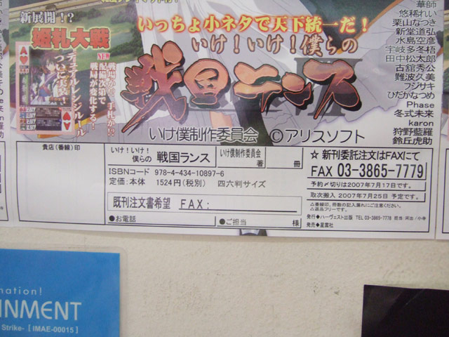 掲示されていたハーベスト出版いけ!いけ!僕らの戦国ランス」のPOP拡大。