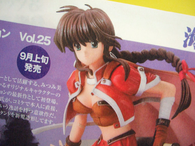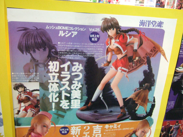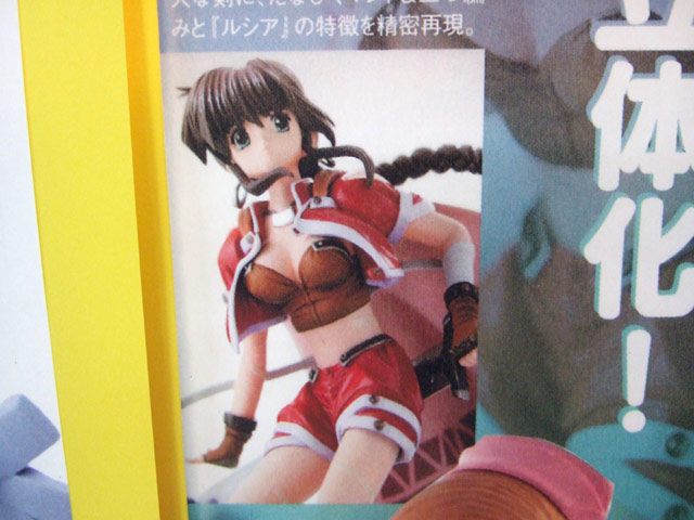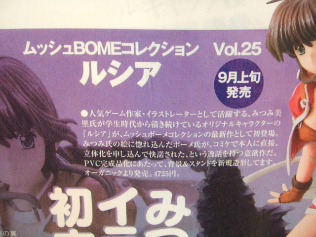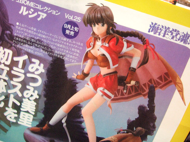 これは、みつみ美里氏が学生時代から描き続けているオリジナルキャラクター「ルシア」を立体化したもので、告知POPによると「人気ゲーム作家・イラストレーターとして活躍する、みつみ美里氏が学生時代から描き続けているオリジナルキャラクターの『ルシア』が、ムッシュボーメコレクションの最新作として初登場。みつみ氏の絵に惚れ込んだボーメ氏が、コミケで本人に直接、立体化を申し込んで快諾された、という逸話を持つ意欲作だ。PVC完成品化にあたって、背景&スタンドを新規造形してます。」「’97年に発表された同人誌の裏表紙イラストを忠実に立体化。巨大な剣に、たなびくマント&三つ編みと『ルシア』の特徴を精密再現。」と紹介されています。