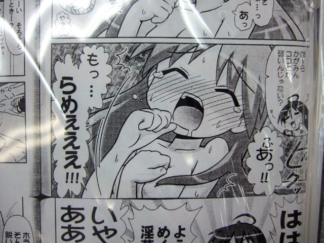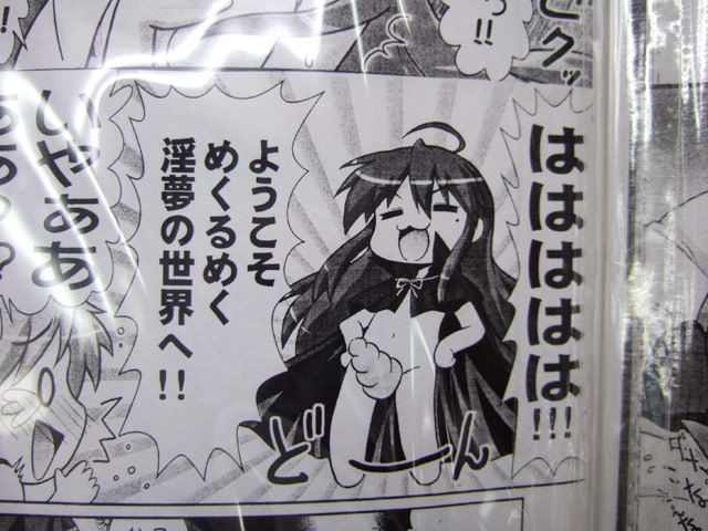 ほか、この同人誌のために描きおこされたマンガのほうでは、かがみがくすぐられて悩ましくあえいだり、夢の中でチョココロネを股間につけたこなたと怪しい感じになってたりしますw