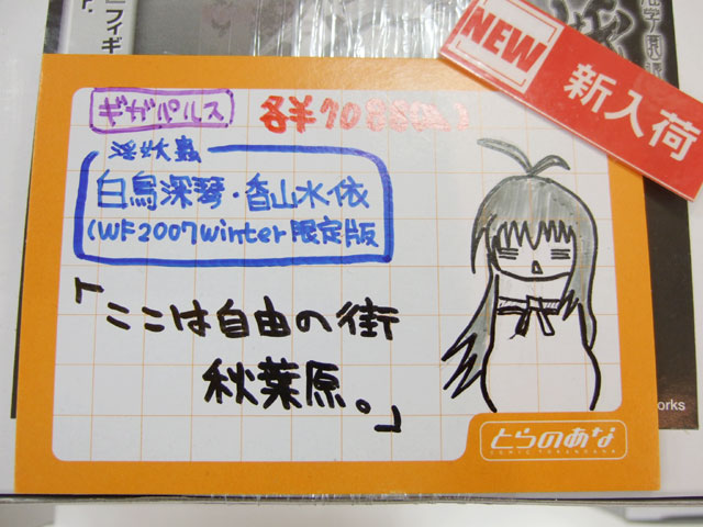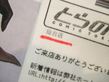 7月14日にオープンした、とらのあな仙台店の開店を記念して、同7月14日から、とらのあな本店にて、マックスのハルヒ3点セット(ハルヒ/みくる/長門)を「とらのあな仙台店のレシートをお持ちの剛毅!!なお客様 先着2名様に販売いたします」としたPOPがあったことをお伝えしましたが、7月16日に実際にレシートを持参して購入に来た方が2名いたらしく、「販売終了」のPOP等と共に、証拠品(?)の仙台店のレシートも掲示されていました。