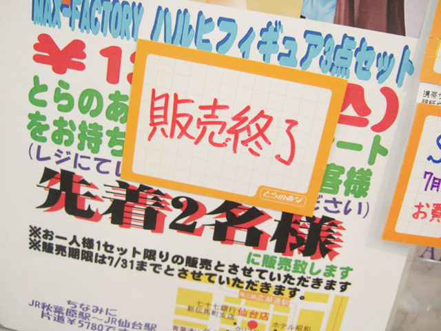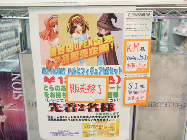 7月14日にオープンした、とらのあな仙台店の開店を記念して、同7月14日からとらのあな本店にて、仙台店のレシート持参で先着2名に「ハルヒフィギュア3点セット」を販売というPOPがあったことをお伝えしましたが、7月16日に実際にレシートを持参して購入に来た方が2名いたらしく、「販売終了」のPOP等と共に、証拠(?)の仙台店のレシートも掲示されていました。