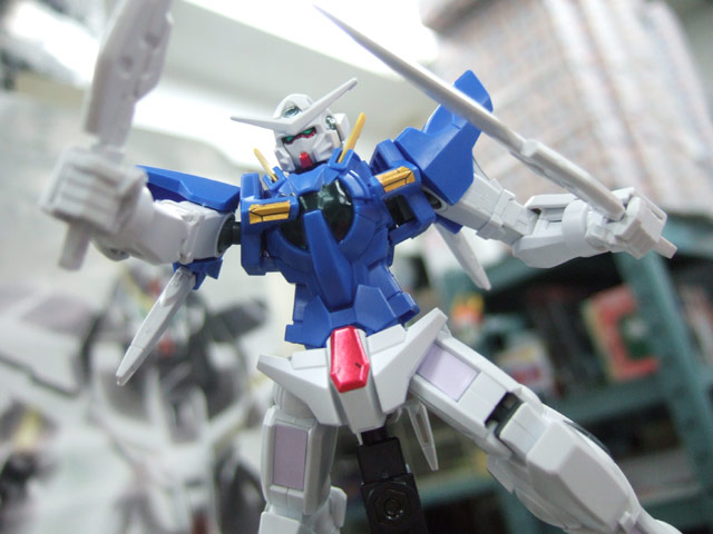 「ガンダム エクシア」は、Wikipediaによると「刹那の乗機。運動性能に優れた近接格闘タイプで、GN粒子発生装置のステルス効果によって自機の存在を隠匿し、単独での有視界戦闘を可能とする。カラーリングはブルーを基調とした伝統のトリコロール。4本のビームサーベルと3本の実体剣、合計7本の剣を装備している。 名前の由来は、エクスシアイ(能天使)だと思われる。 」という機体。