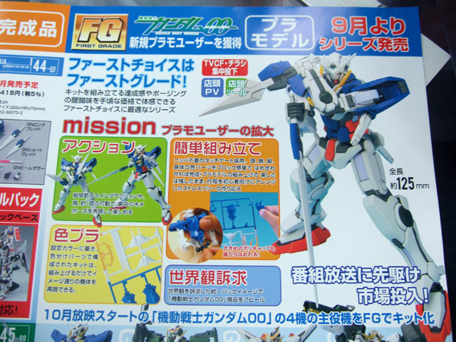 これは、東京おもちゃショー2007のバンダイブースでもサンプル展示のあった、2007年10月から放送開始予定の「機動戦士ガンダム00」の主人公「刹那・F・セイエイ」の搭乗機「ガンダム エクシア」をプラモで立体化したもので、Amazonの商品説明によると『「アクションポーズ再現」「簡単組み立て」を中心とした新コンセプトのFGで、『機動戦士ガンダム00』の機体をリアルな形状でキット化。ヒジ、ヒザの関節可動で劇中のかっこいいキメポーズが再現可能。肩の引き出し式ボールジョイントにより、胸前での腕の交差、構えを再現可能。各関節可動にポリキャップを使用し、よりスムーズな可動を実現。目や各部の細部カラーを表現するたのホイルシールが付属。 」と紹介されています。