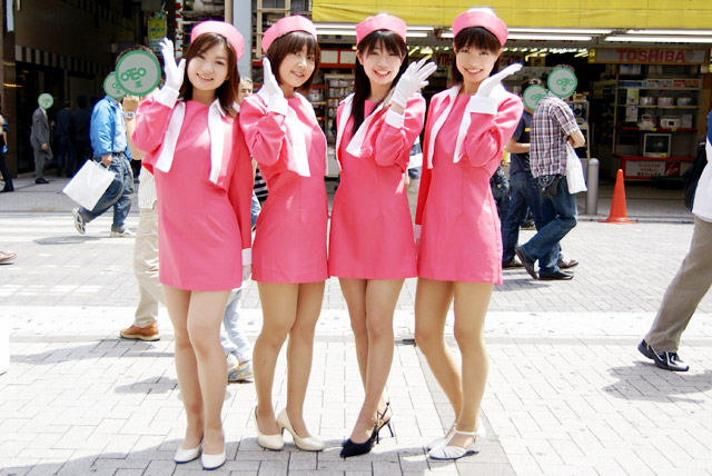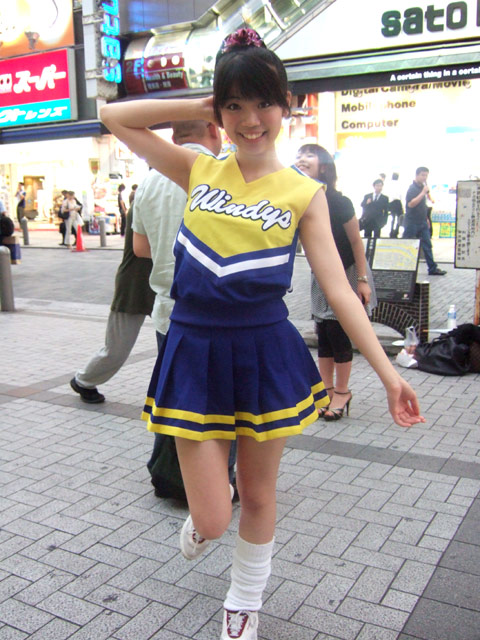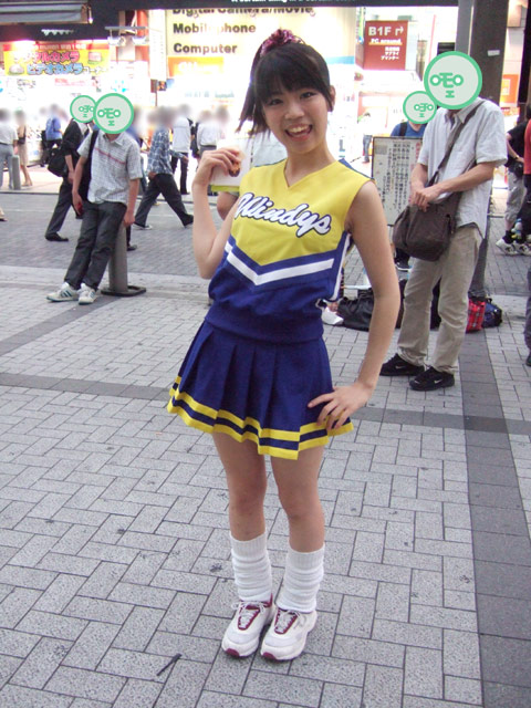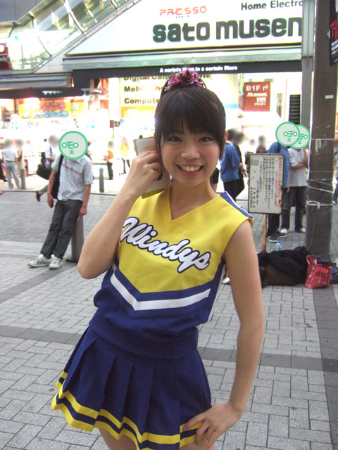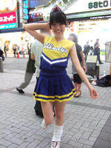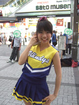 以前ボディスーツの女性戦闘員が告知活動 他、3日の秋葉原ホコ天等の様子でお伝えしたこともある、エレガールずの佐々木悠花さんが、チアガール姿で7月22日(日)開催の「ゆずこしょう&ちょこっと.M&五十嵐アスカ撮影会」と、7月28日(土)開催の「16th ALFA-RIZE LIVE」の宣伝にきていました。