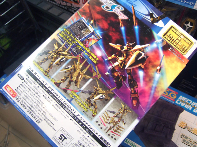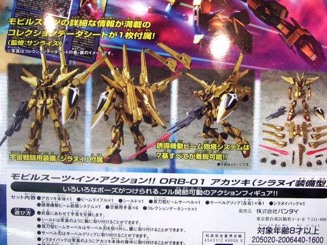 モビルスーツ・イン・アクションシリーズに『機動戦士ガンダムSEED DESTINY』に登場したアカツキが空間戦闘用パック「シラヌイ」とセットの塗装済み完成品アクションフィギュア。 シラヌイに搭載されている7基の「誘導機動ビーム砲塔システム」は着脱が可能。ビームサーベル・ビームライフル・シールドなど基本武装が付属。モビルスーツの詳細な情報が満載のコレクションデータシート1枚付属。サンライズ監修。