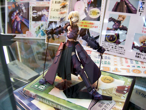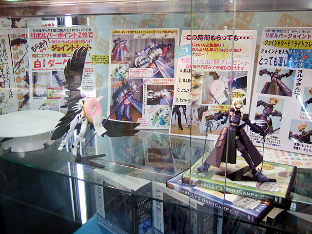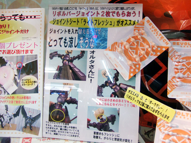 海洋堂ホビーロビーでは、リボルテック関連商品を1つ買うごとに、リボルバーポイントを1点もらえて、2点てジョイントシートがもらえます。そのうちの一つライトフレッシュを用いて、「セイバーオルタ」(AA)のリボルバージョイントの一部を肌色にしたサンプルを展示しています。展示されていたオルタさんはなぜかビリーバンドをもって「ビリーズ ブート キャンプ」(AA)中でしたw