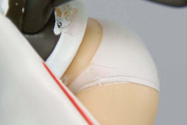 ただ、個体差もあるとは思いますが、異様に接着が硬いので、まずシッポ(?)を外した後、ミニスカと腰の間にマイナスドライバーを差し込んで、ゆっくりじっくり時間をかけてダボの接着をはがさないといけません。ちなみに自分は30分以上かかりましたw