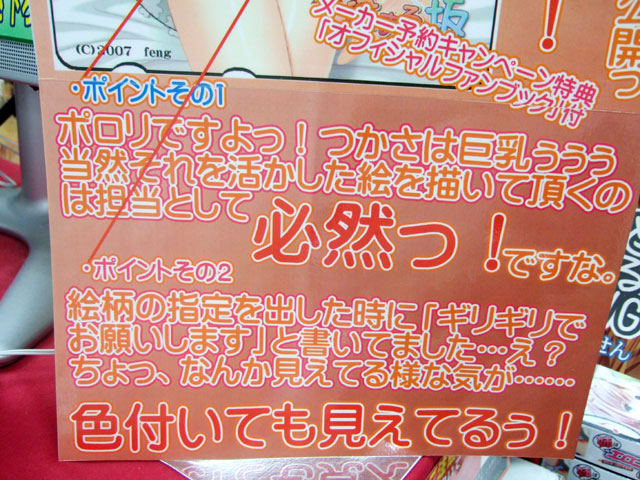 POPにはポイントがかかれていて、それによると乳は「ポロリですよっ!つかさは巨乳ぅぅぅ 当然それを活かした絵を描いて頂くのは担当として必然っ!ですな。」とされ、パンツ部分は「絵柄の指定を出した時に「ギリギリでお願いします」と書いてました・・・え?ちょっ、なんか見えてる様な気が・・・・・・ 色付いても見えてるぅ!」とのことです。