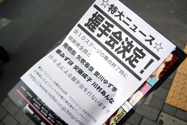 全ての舞台の終了時に南 明奈さん、矢吹春奈さん、愛川ゆず季さん、秦みずほのさん、安藤成子さん、川村あんなさん6名による握手会の開催が決定したということで チラシが配布されていました。