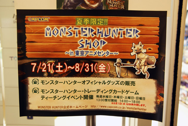 以前お伝えした「モンスターハンターフェスタ 決勝大会」にて好評だったというモンスターハンターショップが、アキバUDX内にある東京アニメセンターにて「夏季限定!!」としてオープンしていました。