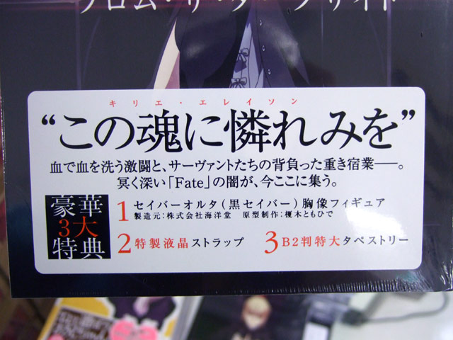 ファンブック、特製液晶ストラップ、黒セイバー胸像フィギュア、B2特大タペストリーが付属。