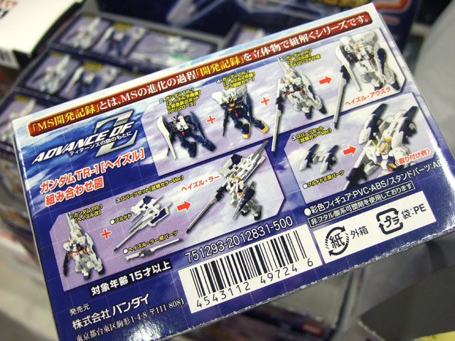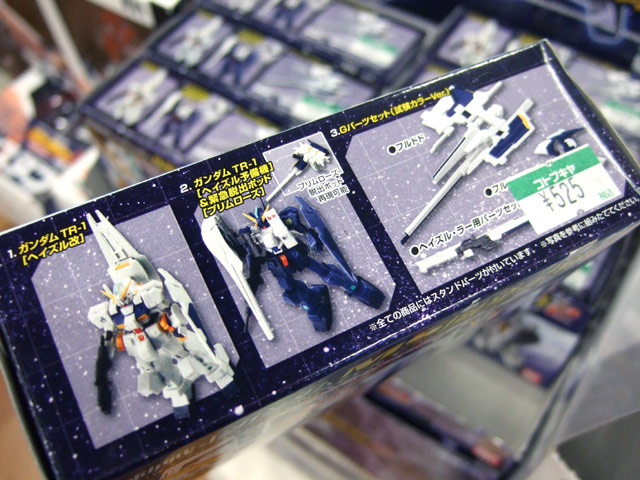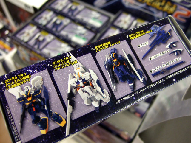 全高各約90mmで、ガンダムTR-1ヘイズル改、ガンダムTR-1ヘイズル2号機 オレンジソール、Gパーツ白&青セット、ガンダムTR-1アドバンスド装備、ガンダムTR-1プリズムローズ装備、次世代量産機(コンセプトイメージ)の全6種類。1BOX8個入り。