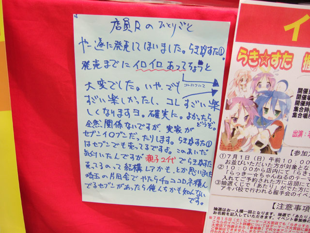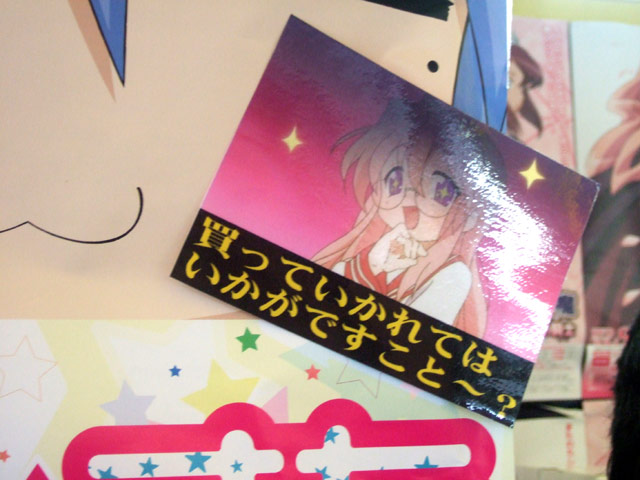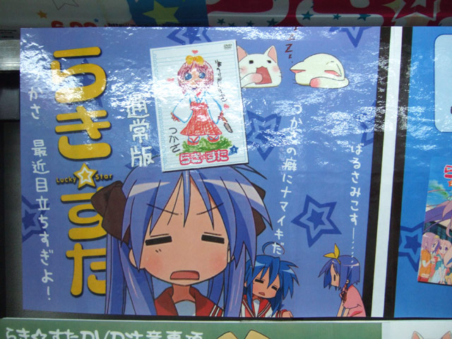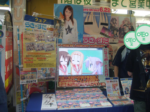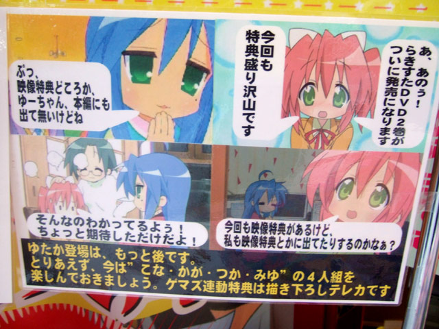 ゲーマーズ本店では店頭で、16話「リング 」に登場するアキバのゲーマーズ前のシーン掲示して、らきすたのDVD展開をしていた場所を「このへん現在地です」としたPOPや、「ゆたかの登場はもっとあとです」「らき☆すたDVD第2巻発売!「みゆきさん、GJ!」の3話や、某交替劇のあった第4話収録今回もこなたはフルドライブ!(違」「かっていかれてはいかがですこと〜?」など、様々なPOPを展開していました。