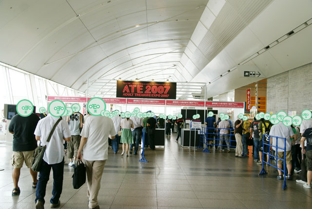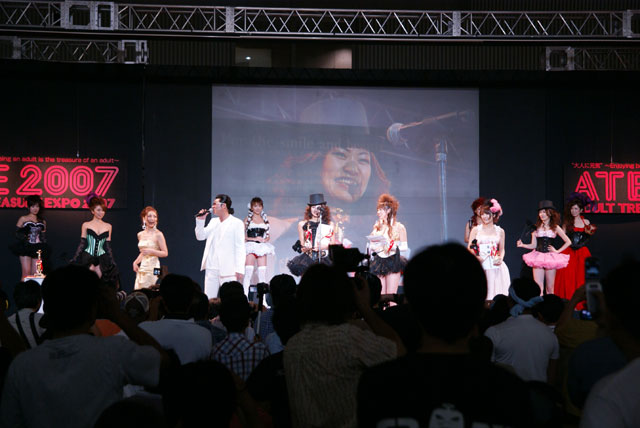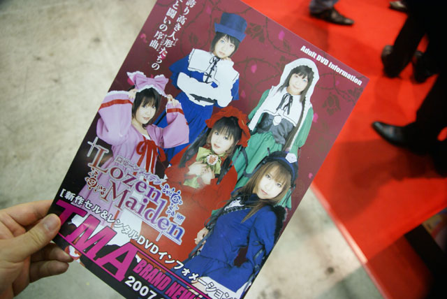 以前お伝えしたように、2007年7月27〜29日の3日間、大人向け作品や商品の展示、販売イベント「アダルトトレジャーエキスポ2007」が開催されました。こちらでは、フィギュア(?)系以外の、会場の様子やコンパニオンさん、いくつかのブースの撮影会(?)の様子などをフォトレポートで。画像は「ロゼーン・メイデン」(AA)も発表された、GLAY’z/TMAブースの様子。