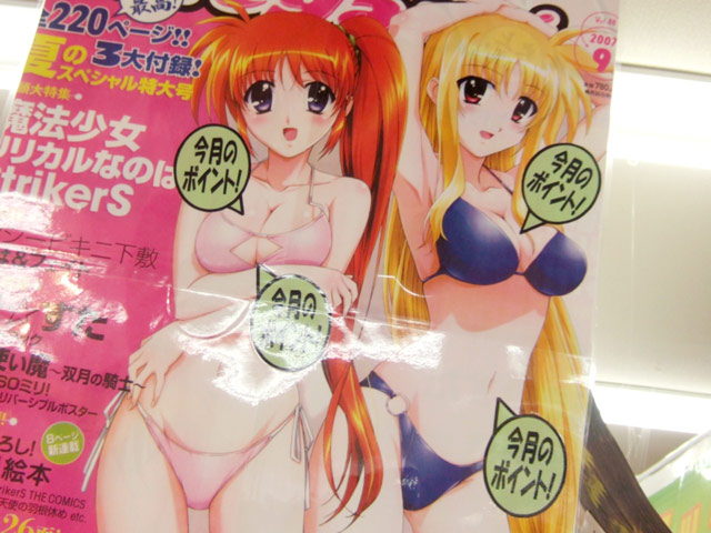 ゲーマーズ本店で掲示されていた、表紙拡大POPにはポイント箇所が指し示してあって、それによるとなのはの乳と下乳の谷間。フェイトの乳の谷間とおへそみたいですw