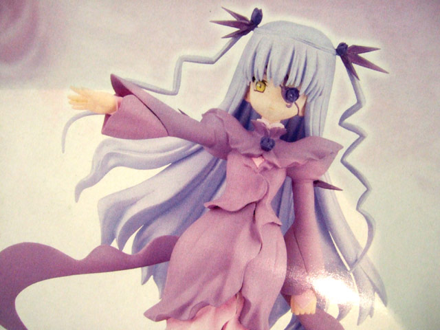 「柔らかく広がった服を大きなラインで追いかけた空間栄えのするポージングになっています。ベースにまでもこだわりを見せた逸品となりました。イメージカラーである藤色に輝く水晶柱の上に立つ薔薇水晶は、可愛らしさの中にも凛々しさを備えた出来になっています。 」