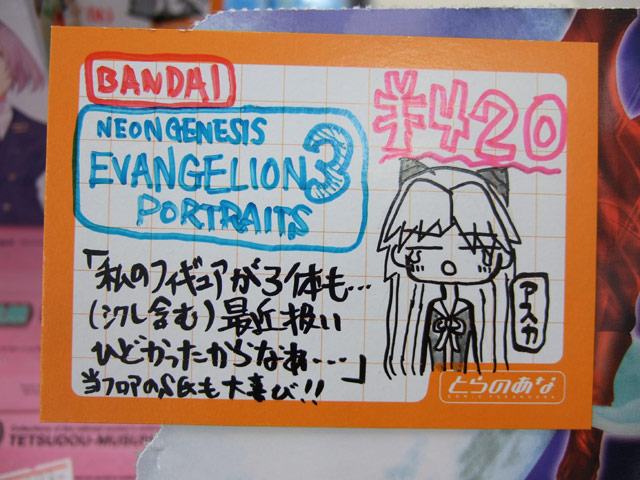 とらのあな本店のPOPでは『「私のフィギュアが3体も・・・(シクレ含む)最近扱いひどかったからなあ・・・」当フロアのS氏も大喜び!!』とのことで、シクレはアスカみたいです。