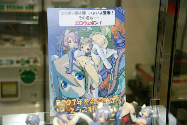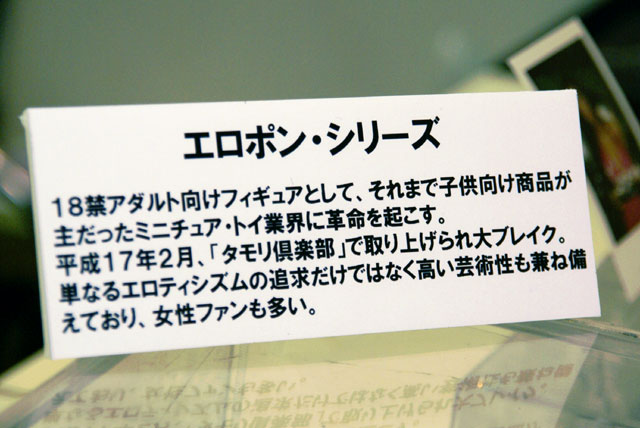 エロポン・シリーズは、展示されていたPOPによると「18禁アダルト向けフィギュアとして、それまで子供向け商品が主だったミニチュア・トイ業界に革命を起こす。平成17年2月、「タモリ倶楽部」で取り上げられ大ブレイク。単なるエロティシズムの追求だけではなく高い芸術性も兼ね備えており、女性ファンも多い。」というものみたいです。