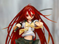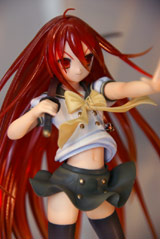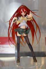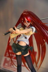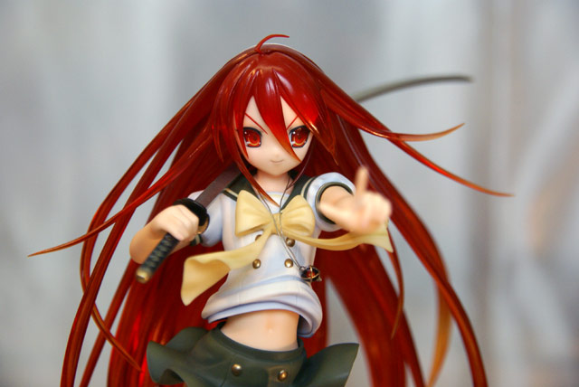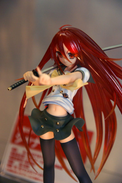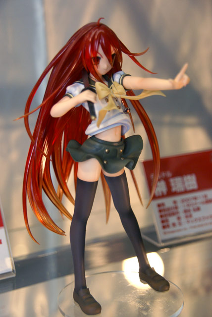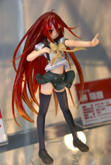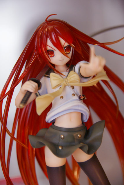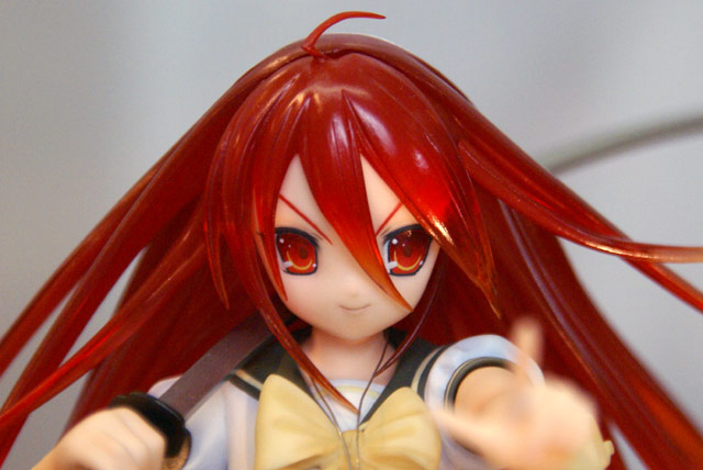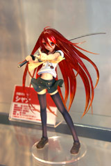 これは、以前、ワンフェス2007冬のWONDERFUL HOBBY LIFE FOR YOU!! 4ブースでも展示のあったもので、マックスファクトリーの商品説明によると「秋から第二期アニメの放送も決定!『灼眼のシャナ』からヒロイン「シャナ」が炎髪灼眼(えんばつしゃくがん)スタイルでの登場です。クリア成形による鮮やかな髪に、指をビシッと突き刺した凛々しいポージング。手にする刀“贄殿遮那(にえとののしゃな)”や“コキュートス”という名のペンダントと、アイテムも忠実に再現しました。「いとうのいぢ」氏のイラストを元に、フレイムヘイズとしての格好良いシャナに仕上げました。」と紹介されています。
