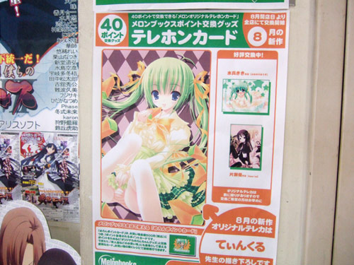 メロンブックスでは、以前大開脚スク水ニーソに白っぽい液体とか、全裸とか、乳首勃起とか、にょろーんとか、色々な作家さんの描き下ろしイラストのメロンちゃんテレカを、メロンブックスが発行している、500円で1ポイントつくポイントカードのポイント40ポイント分で交換できる、ポイント交換グッズとして毎月発表しています。