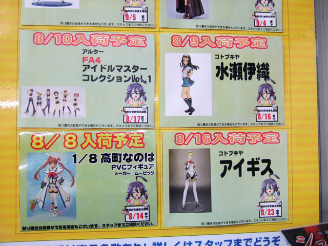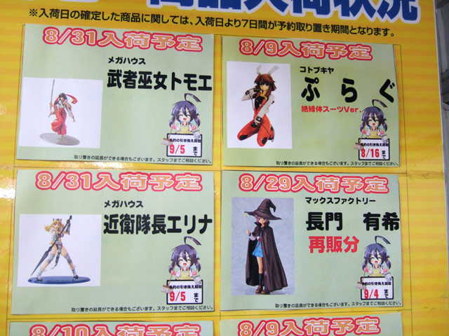 ソフマップ本店の新作フィギュア入荷掲示板が8月入荷予定のものに更新されてました。それによると、マックス「西村キヌコレクション 不知火 舞」(AA)(サンプルレビュー)は8月10日頃入荷予定。他、バンダイ「MG 1/100 ターンエーガンダム」(AA)が8月9日、コトブキヤ「草壁 優季 バカンス Ver」(AA)(サンプルレビュー)が8月22日等、掲載されていた予定日をまとめました!