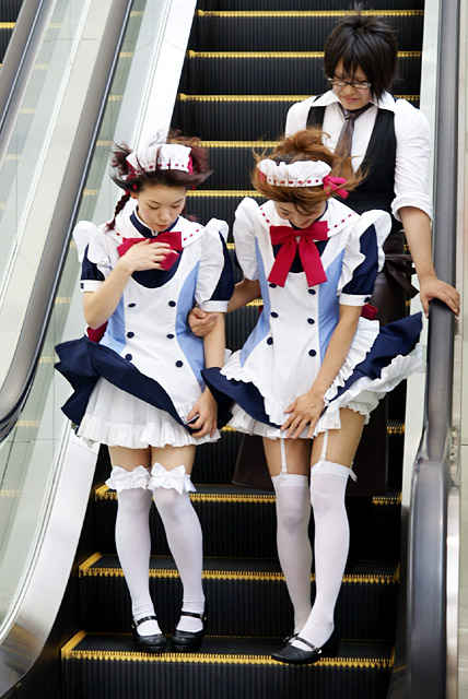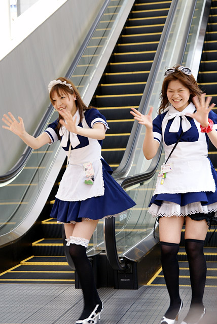 秋葉原UDXにつながる 細かい霧状の水を出して気化熱で涼しくなるエコな冷房装置の設置されたエスカレーター”AKIBA_BRIDGE“から、打ち水に参加するメイドさん達が登場。