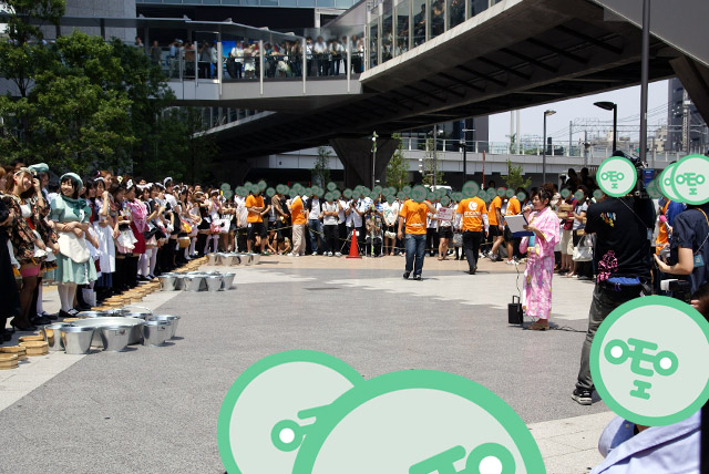 自分も打ち水っ娘Tシャツを着たスタッフの方々を目印に、ヨドバシAkiba前、ぴなふぉあ前にて、通行人の方や店員さんと共に打ち水をしているのを見かけました。