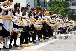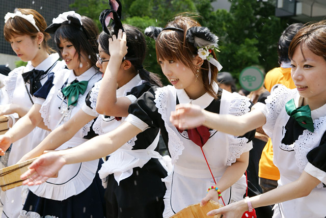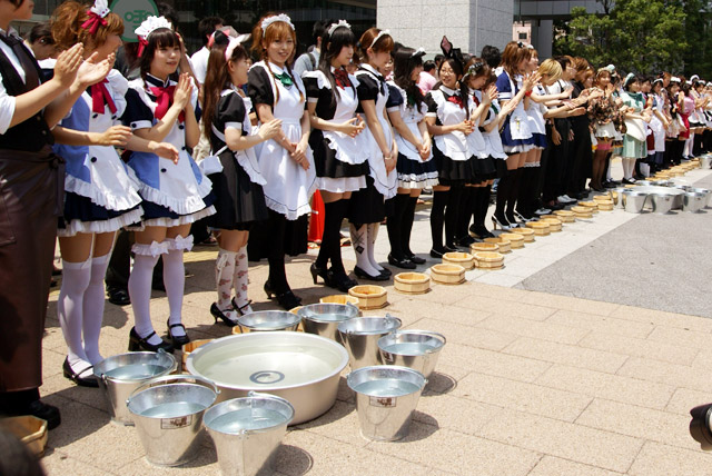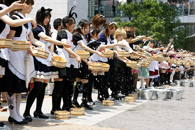 「秋葉原も地球環境を考えている」をキャッチコピーに、地球温暖化対策の啓発活動として4年前から開催され、もはや夏の恒例行事となっている「うち水っ娘大集合!」が8月4日秋葉原西口駅前広場にて開催されました。プレ打ちを遥かに上回る100人近いメイドさんがいたのでは?と思われる規模で 駅前広場は華やかな活気に溢れていました。 打ち水って楽しくってエコロジー!