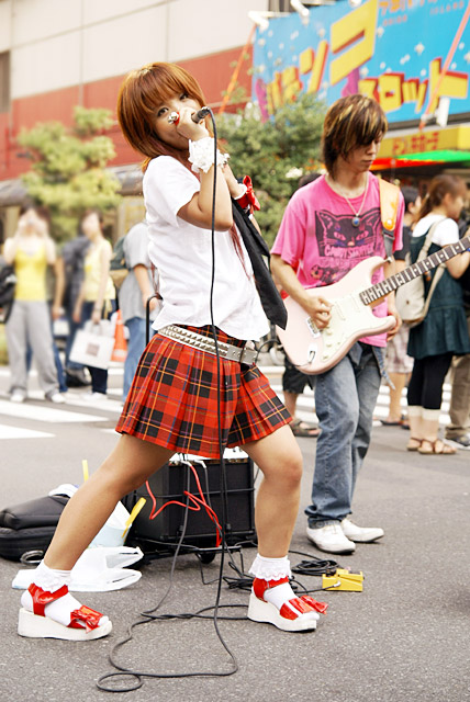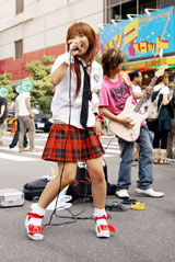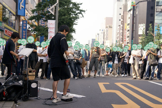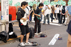 エレキギターの演奏によるロック調の「北斗の拳」の主題歌が流れてきたので、人垣の中をのぞいてみると男性の2人ユニット、主に中野で活動中の同人楽団中野アニソン燃/萌ギター研究所の方でした。