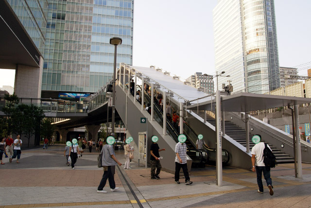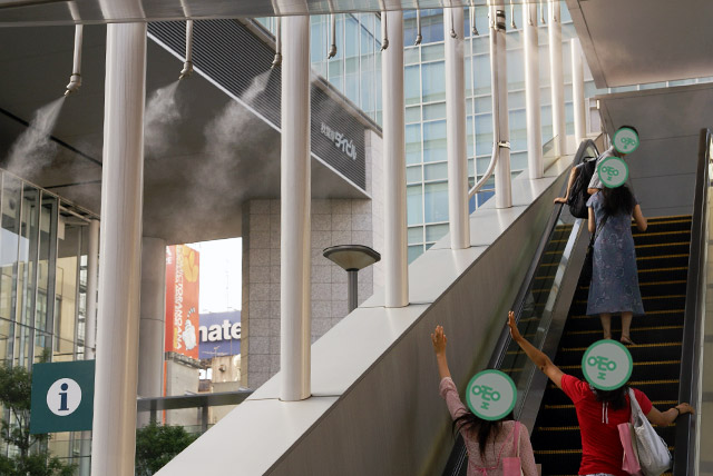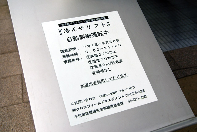 先日お伝えした「ご主人様のために 打ち水で秋葉原を冷まします!」うち水っ娘大集合!2007にて、メイドさんの登場時に使用されたドライミスト装置の設置された”冷んやリフト”。
