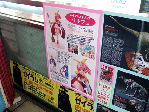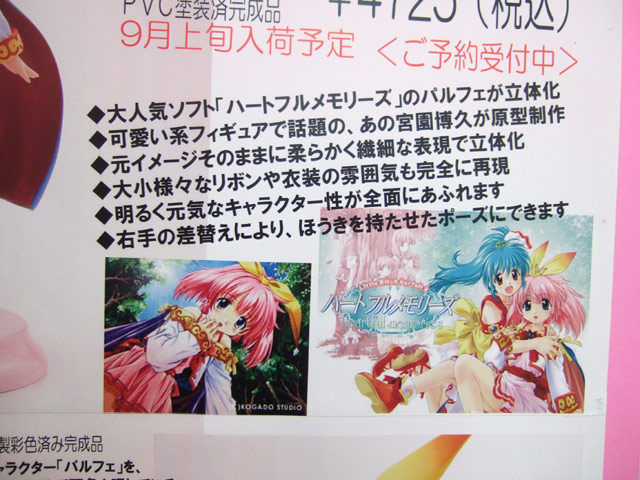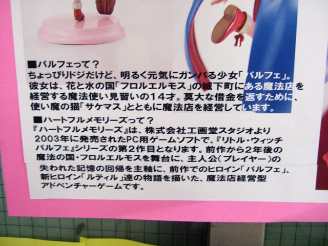 他、POPには別途キャラと元ゲーの解説も書かれていて、それによるとパルフェは「ちょっぴりドジだけど、明るく元気にガンバる少女「パルフェ」。彼女は、花と水の国「フロルエルモス」の城下町にある魔法店を経営する魔法使い見習いの14才。莫大な借金を返すために、使い魔の猫「サケマス」とともに魔法店を経営している。」というキャラみたいです。