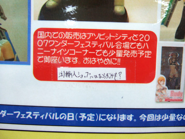 前述の通り、日本国内では8月12日開催のワンダーフェスティバル2007夏会場のハニーナイツコーナーと、同じく8月12日からアソビット(店舗及びアソビットネットショップ)の2箇所で、合計200個のみの販売となりますが、キャラシティのPOPによると「(海外版なので)注)輸入ショップにはならぶかも?」とのことでした。