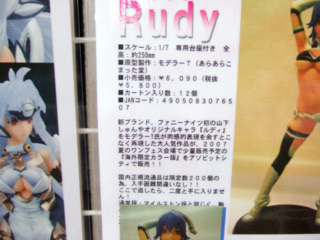 掲示されていた別の種類のPOPの商品説明によると「新ブランド、ファニーナイツ初の山下しゅんやオリジナルキャラ『ルディ』をモデラーT氏が肉感的表現を余すことなく再現した大人気作品が、2007夏のワンフェス会場で少量販売予定の『海外限定カラー版』をアソビットシティで販売!!国内正規流通品は限定数200個の為、入手困難間違いなし!!ここで逃したら、二度と手に入りません!」と紹介されているとおり、国内だと200個限定みたいです。