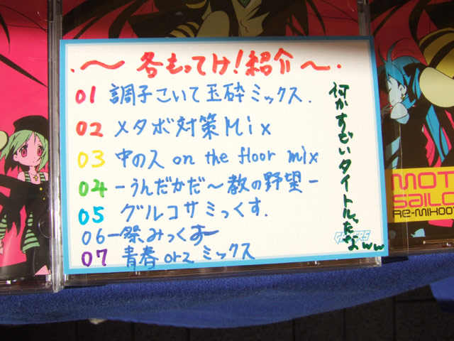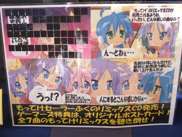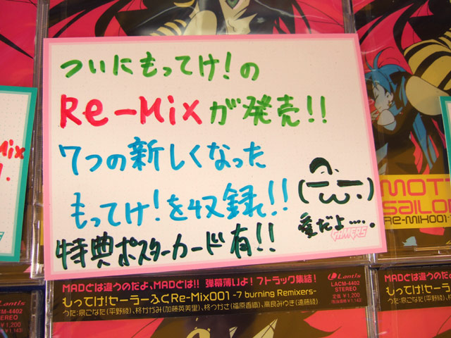 ゲーマーズ本店の店頭には「通称”弾幕”」を用いた4コママンガ風POPや、「ついにもってけ!のRe-Mixが発売!!7つの新しくなったもってけ!を収録!!特典ポストカード有!! (−ω−.)愛だよ…(文章上AAの)は省略)」「むふふぅ〜。ただの持ってけではないのだよ!!ただの持ってけでは!! byこ○たさん」「赤いアイツも及ばない!7倍!持ってけ!を7倍楽しめます!!」などと書かれたPOPが掲示されていました。
