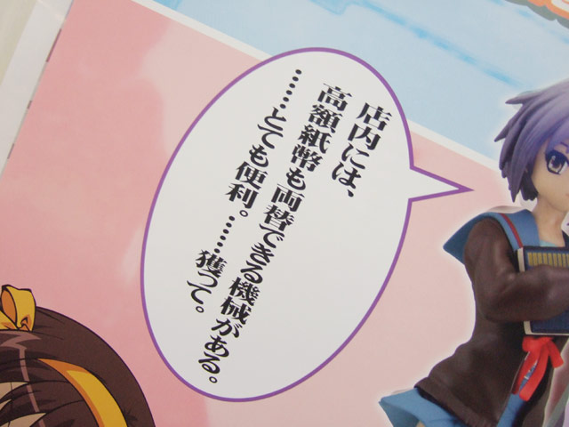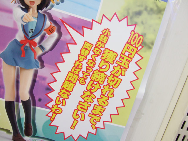 ポスターでは、ハルヒが「100円玉が切れるまで、獲り続けなさい!小銭がなくなっても両替すれば問題ないわ!」、長門が「店内には、高額紙幣も両替できる機械がある。・・・・・・とても便利。・・・・・・獲って。」といっていて、いずれにしてもものごっつ使わせようとしているセリフがハルヒらしいですなw