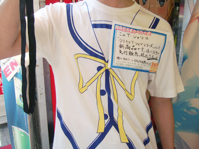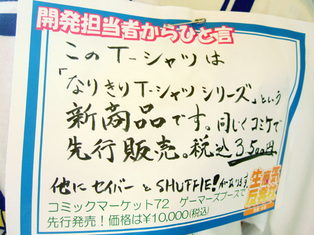 他、『このT-シャツは「なりきりT-シャツ シリーズ」という新商品です。同じくコミケで先行販売。税込3,500円 他にセイバーとSHUFFLE!があります。』というPOPをつけて店員さんが着ていた「なりきりTシャツシリーズ」や、奥に展示されていた「MFバスタオル」等もC72のブロッコリーブースで販売するみたいです。