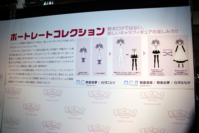2007年8月12日に開催されたワンフェス2007夏では、コスプレ衣装等で知られるCOSPAが、フィギュア&ドールの販売を開始するらしく、新ブランド「レジーニャ!」の発表と、フィギュア原型やサンプルなどを展示していました。温泉天国氏原型のフィギュアも中々魅力的でしたが、ドールヘッドとしても使える仕様の「ポートレートコレクション」は面白い試みかも!w