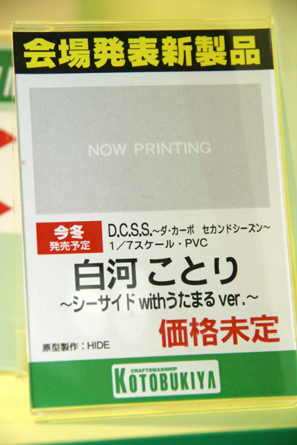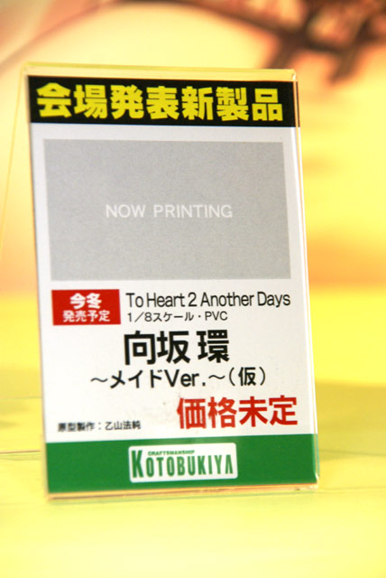 2007年8月12日に開催されたワンフェス2007夏のコトブキヤブースでは、会場初公開の「To Heart2 Another Days(久寿川ささら 〜スク水メイドVer.〜)」や、「ゼロの使い魔(ルイズ〜小悪魔Ver.〜)」(サンプルレビュー)といった美少女ものの他、「Halo3(マスターチーフ)」(AA)や、プラモ「スパロボOGOG(武神装攻ダイゼンガー“逸騎刀閃”)」等の「燃え」系も充実。