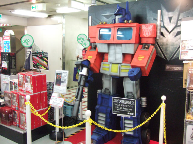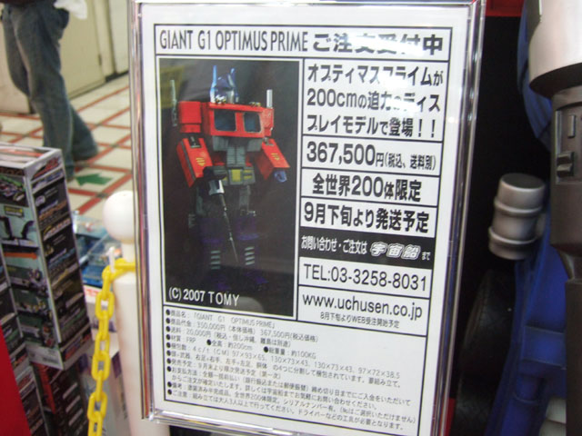 ワンフェス2007夏にいっていたので、何日からかは不明ですが、宇宙船の店頭にて、全高約2,000mmで、総重量100kgのフィギュア(?)の「ジャイアント・オプティマスプライムG1」のサンプル展示が開始しています。全世界で200体限定らしく。価格は税込367,500円。「オプティマス・プライム」とは、Wikipediaによると、サイバトロン総司令官「コンボイ」の英語版名称。