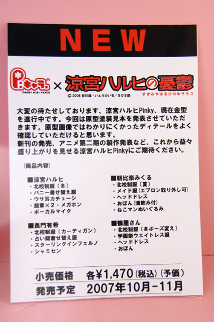 2007年8月12日に開催されたワンフェス2007夏の、今までお伝えしたメーカーブース以外のメーカーブースの様子を、6回に分けてお伝えします。こちらでは、コナミ、G.S.I.クレオス、ソリッドシアター、ダイキ工業の計4ブースの様子をお伝えします。画像はダイキ工業の「触乳2 相沢さなえ」(AA)の展示の様子。見た感じ、パンツは別パーツぽいですが、「具」の有無はわからず。