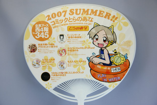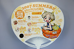 コミケ70レポでもお伝えし、意外と好評でしたので、今回もコミックマーケット72の企業ブースで配布されていた「うちわ」と、若干うちわではない配布物等をあわせてお伝えいたします。ただし、今回も自分が頂けたもののみで、配布が終了していたり、購入特典だったもの等は含まれません。画像はアニプレックスで配布されていたグレンラガンのヨーコの絵柄のうちわ。