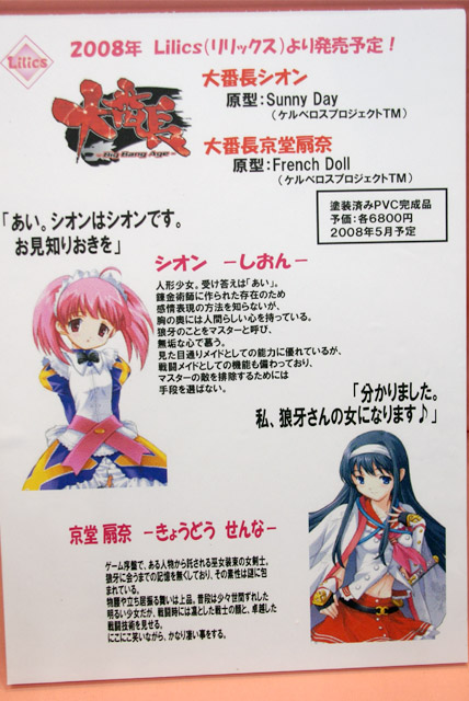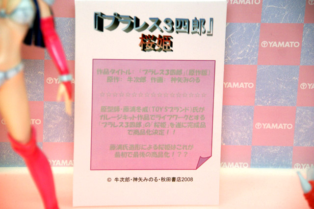 2007年8月12日に開催されたワンフェス2007夏の、今までお伝えしたメーカーブース以外のメーカーブースの様子を、6回に分けてお伝えします。こちらでは、ムサシヤ、やまと、Yujin、Lilics、和風堂玩具店の計5ブースの様子をお伝えします。画像はやまとの「Creators’Labo プラレス3四郎 桜姫 ポリストーンスタチュー」。原型製作は藤浦冬威氏(TOY’Sブランド)。
