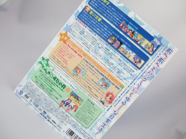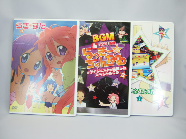 今回も初回版は本編DVD、BGM&ラジオ番組「らっきー☆ちゃんねる」ダイジェストCD、ミニゲームCD-ROM「らき☆すたの森3」が、それぞれ薄型トールケースに収められていました。