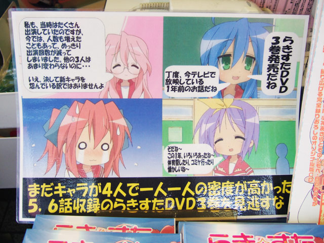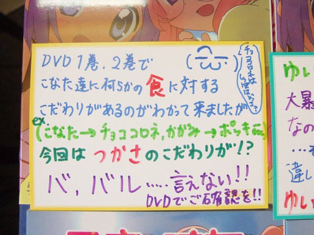 ゲーマーズ本店では、毎回色々なPOPを展開していますが、今回も「DVD1巻、2巻でこなた達に何らかの食に対するこだわりがあるのがわかって来ましたが(こなた→チョココロネ、かがみ→ポッキー)今回はつかさのこだわりが!?バ、バル・・・言えない!!DVDでご確認を!!」や「ゆい姉さんと黒井先生が大暴れなDVDの第3巻なのに・・・ジャケットの絵小さくないっすか・・・そうか、これはきっと何かの布石にちがいな(ry・・・うわ、まて、なにをする・・・ ゆい姉さんと黒井先生に愛の手を」や、「今巻は夏ならでわの話を収録!!海だ!水着だ!らき☆すただだ!・・・!」などといったPOPが掲示されていました。