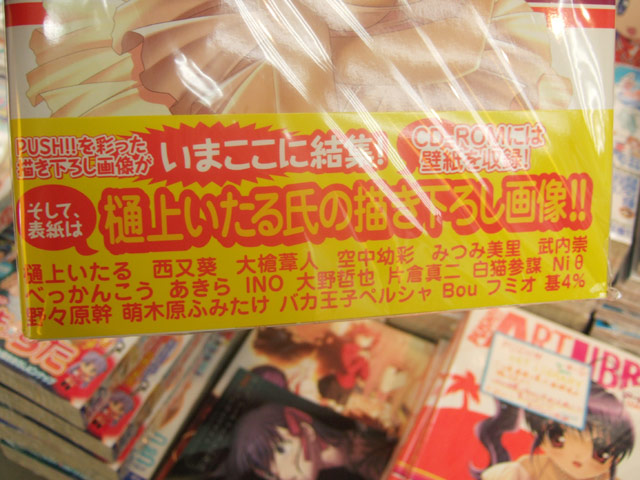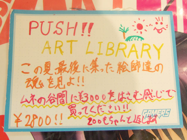 マックス発行のエロゲ雑誌「PUSH!!」に掲載されたイラストをまとめ、壁紙を収録したCD-ROMも付属の画集「PUSH!!アートライブラリー」(AA)が8月25日には発売されています。表紙は、リトルバスターズ!の原画も担当されている樋上いたる氏描き下ろしの巨乳娘イラストで、ゲーマーズ本店のPOPでは、「ムネの谷間に¥3000をはさむ感じて買ってください!!」とのことw
