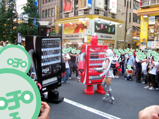 8月26日、以前6月24日の秋葉原の様子としてお伝えしたことのあるベンディングマシンレッドの新しい仲間?なのか、やけに乳部分が目立つダイエットコーラをイメージ?したコスチュームに身を包んだ女性が、ベンディングマシンレッドと一緒に行動していました。