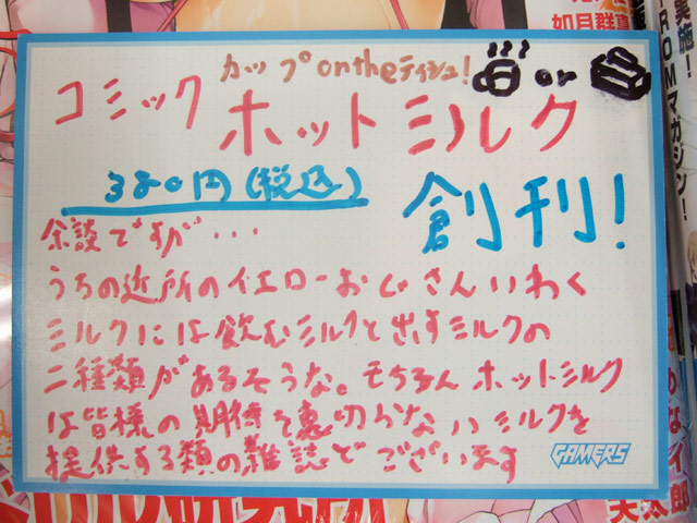 数日前から見かけた気もしますが、コアマガジンコミック・ホットミルク 2007年 10月号」(AA)が27日に発売日を迎えました。これは、ゲーマーズ本店のPOPによると「ミルクには飲むミルクと出すミルクの二種類があるそうな。もちろんホットミルクは皆様の期待を裏切らないミルクを提供する類の雑誌」という、休刊していた伝統ある雑誌名が復活した、大人向けコミック誌。