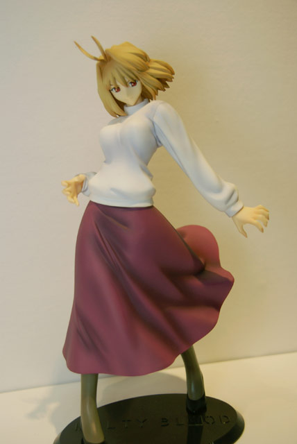 これは、ワンフェス2007夏のアルターブースでも展示のあったもので、グッスマの商品説明によると「朱い月のブリュンスタッド」、真祖の姫君アルクェイド!「TYPE-MOON」デビュー作『月姫』の続編でアーケード、PS2と幅を広げる人気格闘ゲーム『MELTY BLOOD』より、吸血鬼の大元である「真祖」アルクェイドを立体化。圧倒的な力と美しさを兼ね備えた彼女の戦闘シーンをイメージし、シンプルな装いを感じさせない造形に仕上げました。毛先や指先までこだわった細かい動きを感じ取ってもらえる逸品です。」と紹介されています。